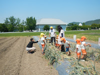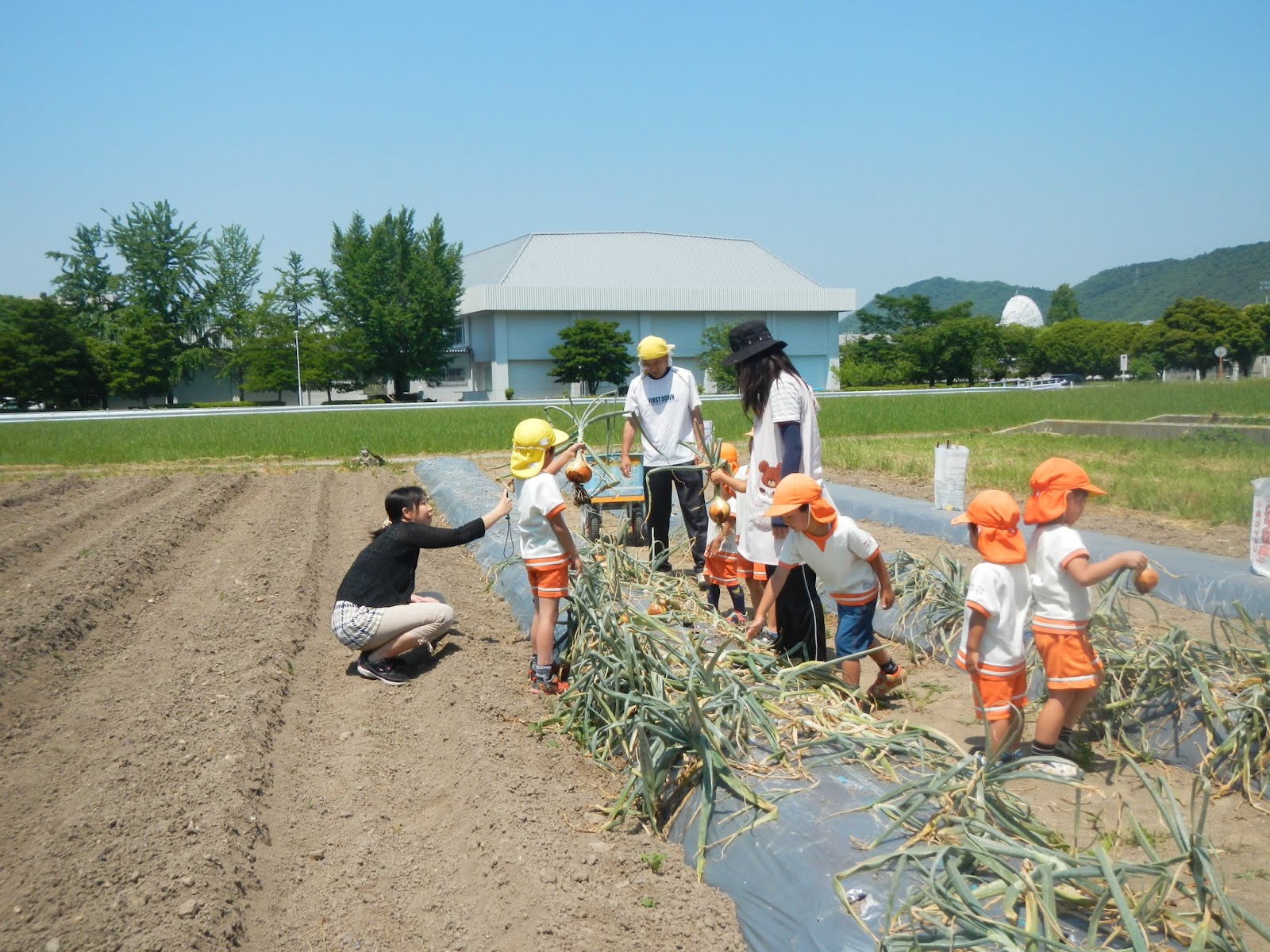 平成27年6月22(月)に岐阜大学の附属保育園である「ほほえみ」の園児たちが、フィールドセンター北農場で栽培しているじゃがいもの収穫を行いました。一つの株から大きいイモや小さいイモ、様々な大きさのイモが収穫でき、皆楽しみながら収穫してもらいました。先日行ったタマネギの収穫に引き続いてジャガイモも園での給食に利用していただきます。今後も様々な農作物の収穫を予定しています。園児の皆さん楽しみにしていてくださいね。