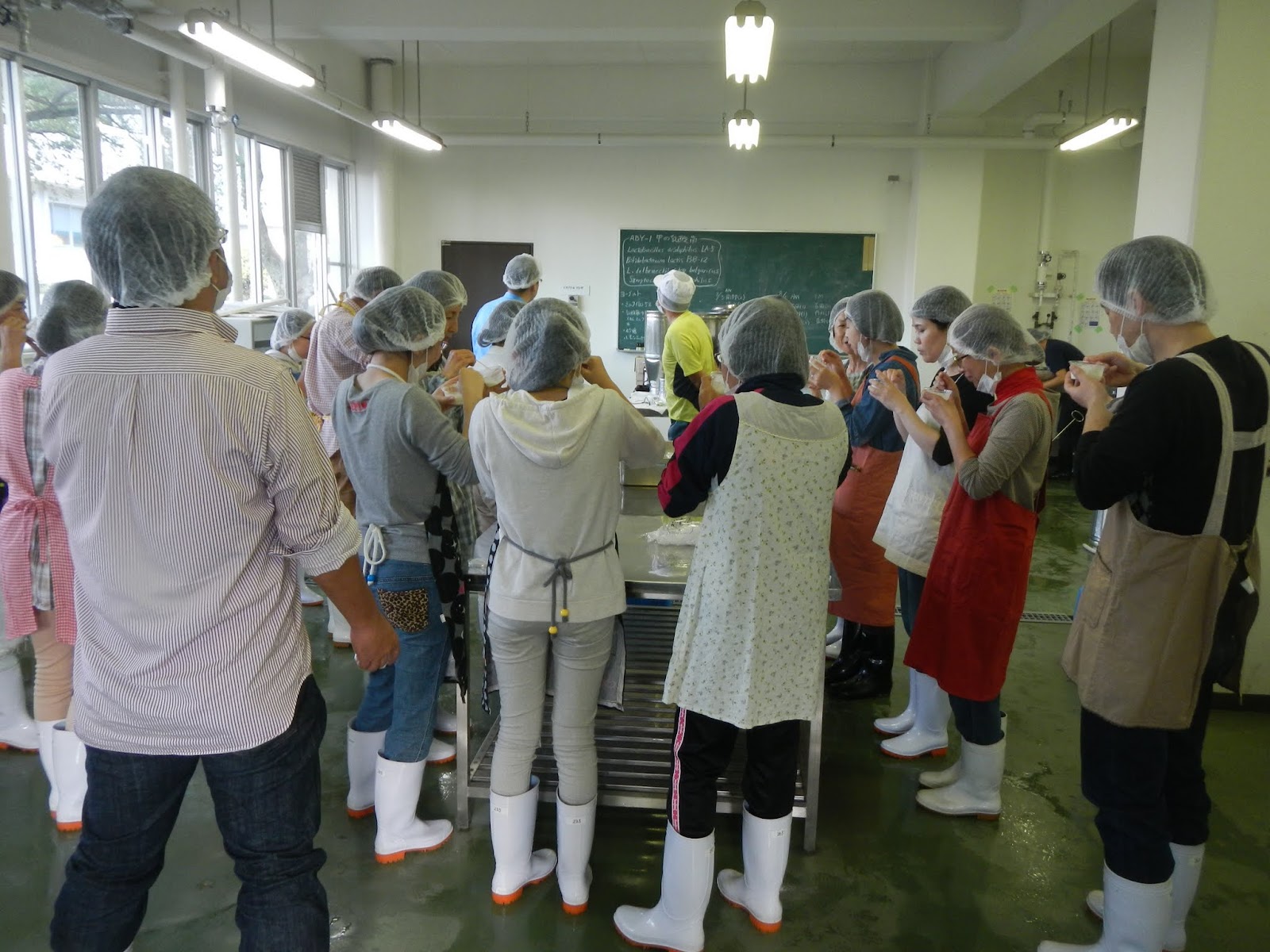 その後加工室に移動し、実際にヨーグルトとソフトクリームの作成を行いました。数種類の原料を混ざりやすくするためや、温度を上げて殺菌するためにこまめに温度を調整する必要があり、なかなか大変な作業となりましたが、参加者の皆さんが協力しあって完成させることが出来ました。